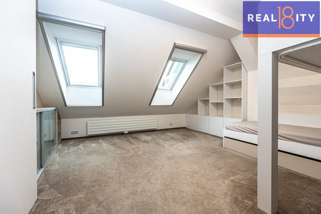 Připraven k okamžitému nastěhování – nabízen včetně veškerého nadstandardního vybavení a nábytku na míru. Kuchyně značky Hanák se spotřebiči Bosch, kožená sedačka a další značkové zařizovací předměty interiéru, dětský pokoj z masivu udělaný na míru, prostorná šatna s botníkem a policemi, vestavěné skříně.