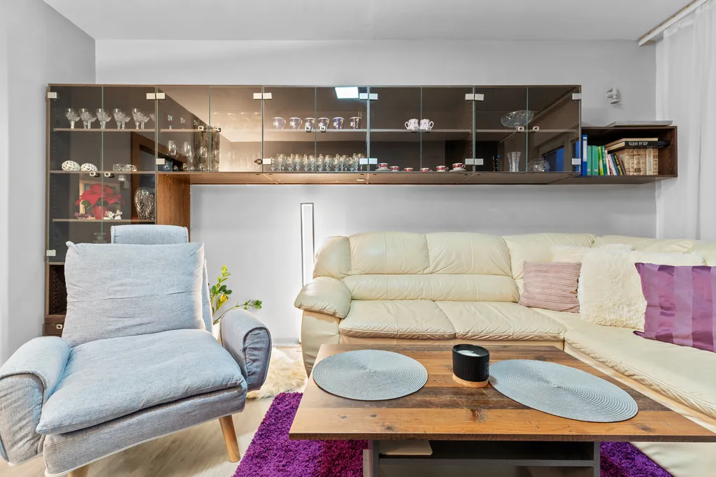 Dominantou bytu je světlý obývací pokoj, ideální pro odpočinek i setkávání s rodinou.