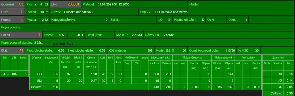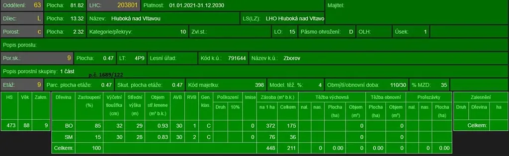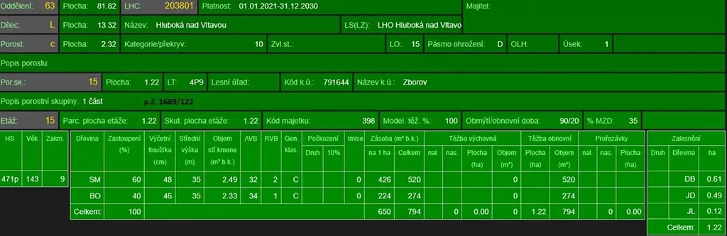 - p.č. 1689/122 vedená jako lesní pozemek o celkové výměře 23 149 m2, vlastníme podíl 1/8 tedy 2 894 m2 (stáří lesa 147 let - zastoupení dřevin smrk, borovice, stáří lesa 109 let - zastoupení dřevin borovice, smrk, stáří lesa 92 let - zastoupení dřevin borovice, smrk, stáří lesa 18 let - zastoupení dřevin borovice).