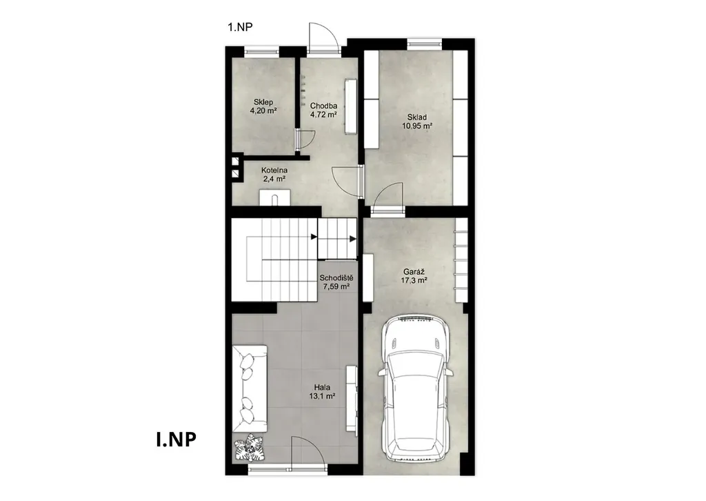 V přízemí se nachází vstupní hala 13,1 m², schodiště 7,59 m², chodba 4,72 m², garáž 17,3 m², kotelna 2,4 m², sklep 4,2 m², sklad 10,95 m² a vstup na zahradu o velikosti 75 m². Tyto prostory lze po úpravách využít také jako další obytné místnosti.