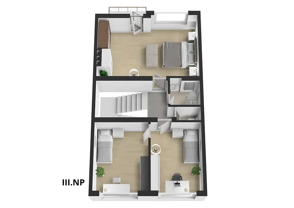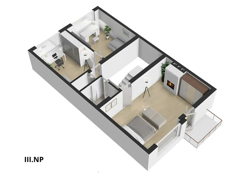 Druhé patro tvoří tři pokoje o velikosti 11,3 m², 12,1 m² a 24,15 m², dále koupelna 1,75 m², samostatné WC 1,12 m², schodiště 7,59 m² a balkon 2,7 m².