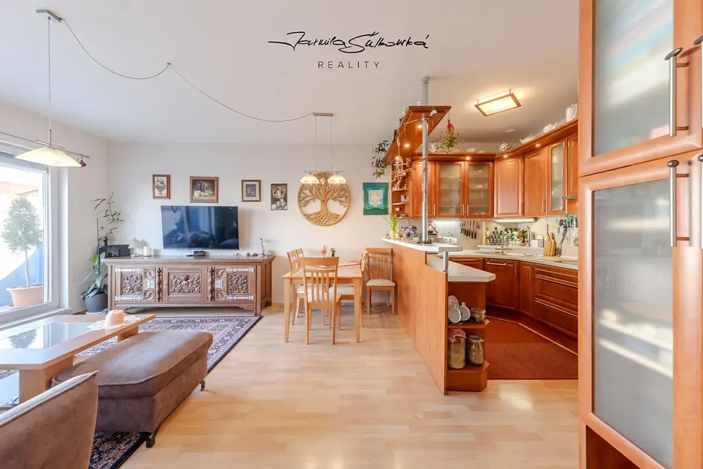 Srdcem bytu je světlý obývací pokoj s velkorysou kuchyní a vstupem na terasu.