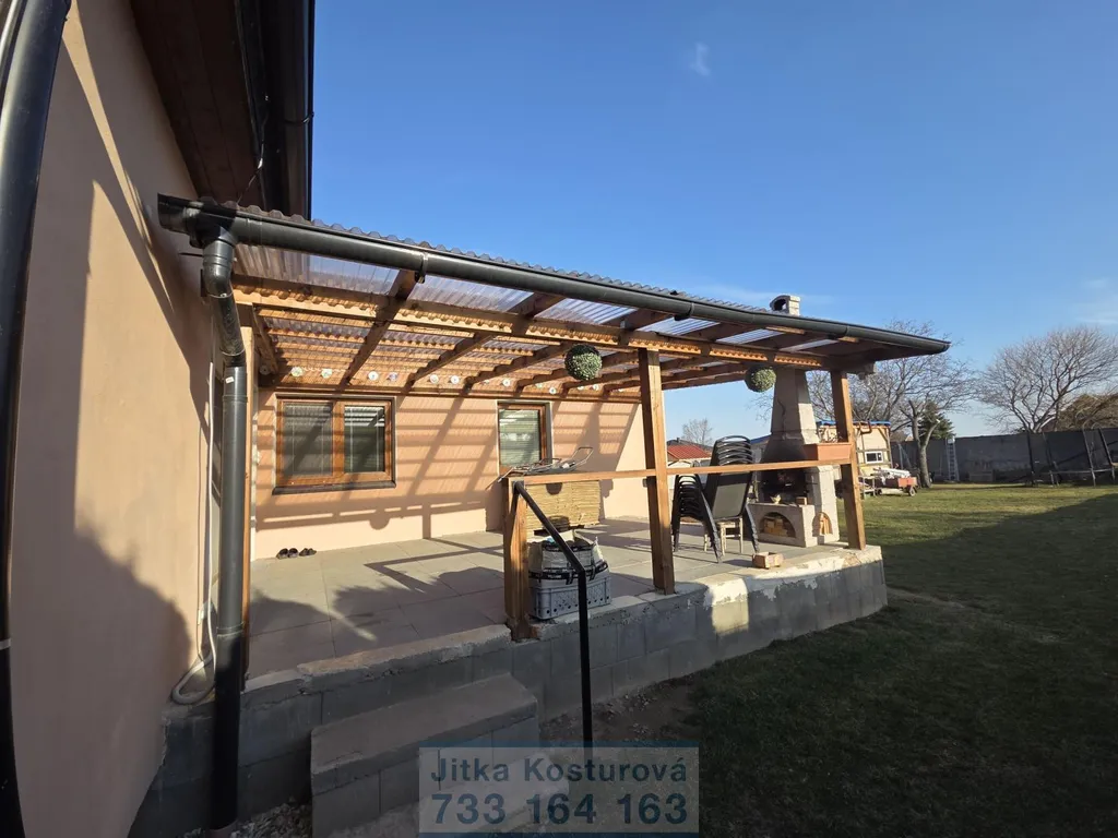 Součástí pozemku je terasa, pergola s osvětlením, dřevěný zahradní domek, nádrž na dešťovou vodu o objemu 5 m and sup3; a venkovní LED osvětlení chodníku na čidlo. Pozemek je oplocen a vjezdová brána je na automatické ovládání.