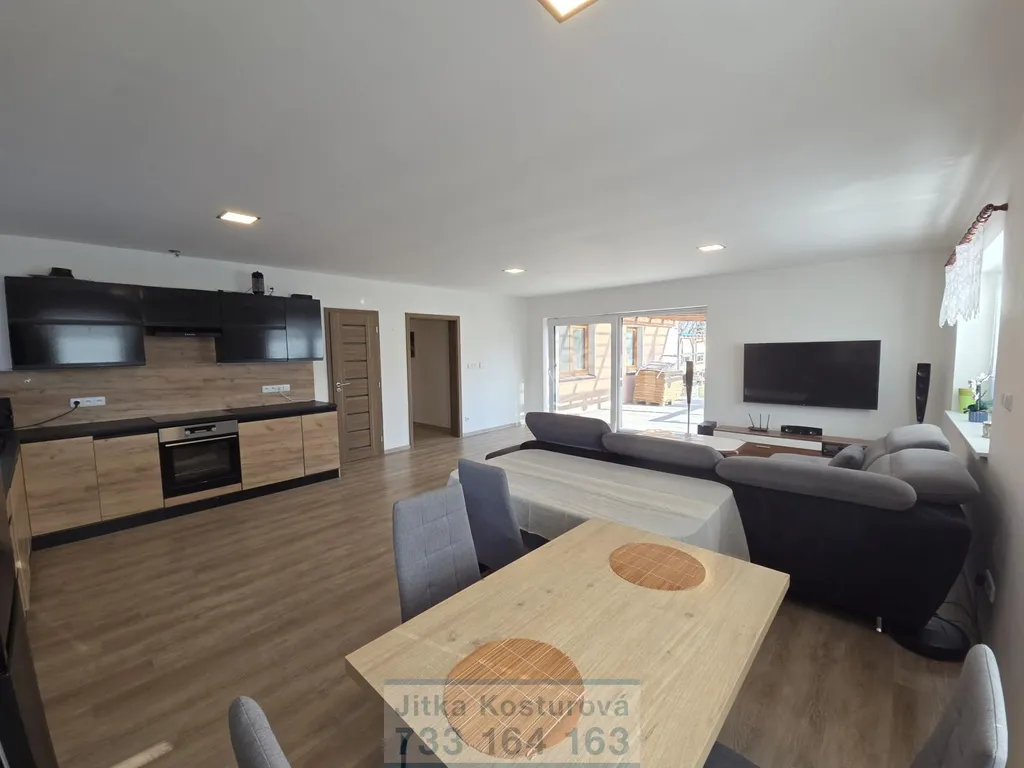 Dominantou domu je prostorný obývací pokoj s kuchyňským koutem, odkud je přímý vstup velkými prosklenými dveřmi na terasu a zahradu. Kuchyňská linka je vybavena indukční varnou deskou, elektrickou troubou, digestoří a myčkou. Praktickým doplňkem je komora na potraviny.