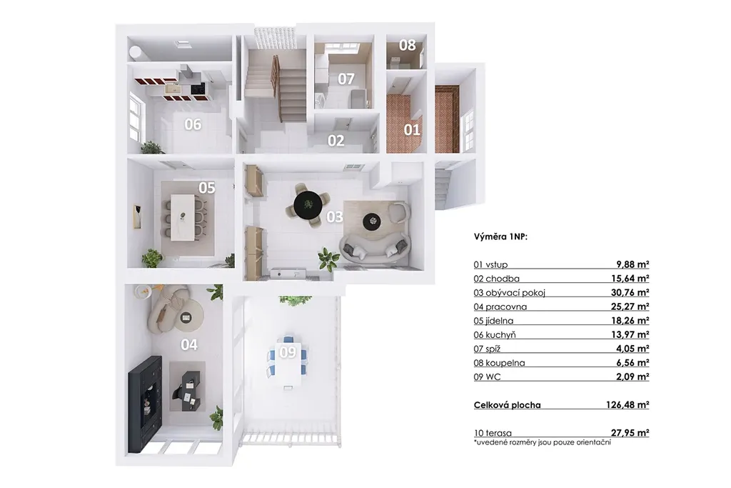 Přízemí: obývací pokoj, jídelna, kuchyň, spíž, zimní zahrada s přímým vstupem na terasu, koupelna a technická místnost.