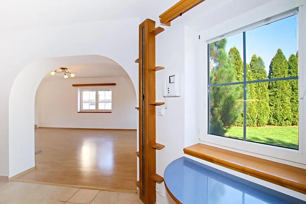 Z obývacího pokoje je přímý vstup francouzským oknem na prostornou terasu. Terasa je zčásti otevřená a zčásti zastřešená. V prvním patře se nachází 3 ložnice s balkóny a hlavní koupelna s rohovou vanou, dvěma umyvadly a WC. V celém domě je plovoucí podlaha a vyhřívaná keramická dlažba. Vytápění zajišťuje plynový kotel Viessmann. Dům je vhodný pro rodinu s dětmi i na bydlení spojené s podnikáním. Dům se pronajímá nezařízený, pouze kuchyně je zařízena linkou se sklokeramickou varnou deskou, troubou, digestoří, středovým pracovním pultem. Pohodlné čisté bydlení v přírodě se snadnou dostupností do Prahy. Stanice MHD 2 min. chůze, vlakem do centra 20 min. Kompletní infrastruktura - školy, školky, obchody, restaurace, zdravotnické zařízení i úřady. Majitelé tolerují max. jednoho pejska malé rasy.