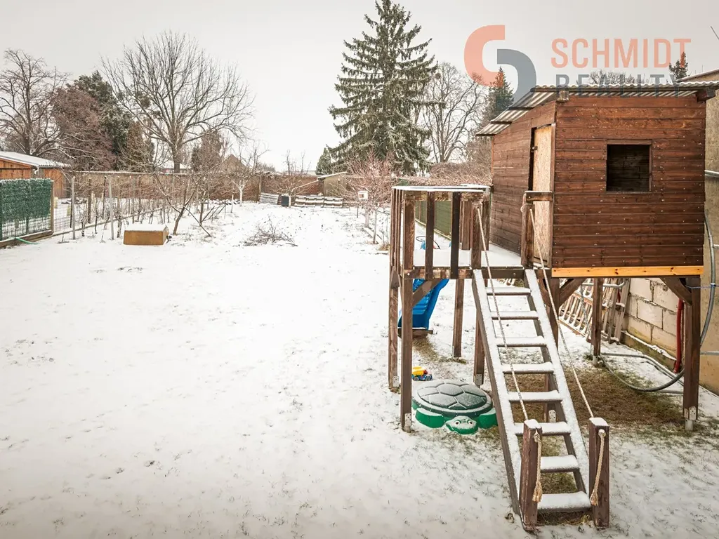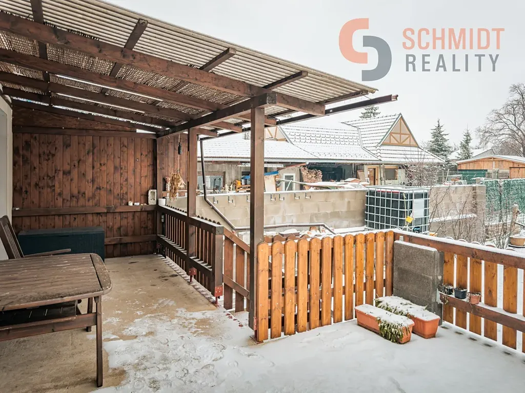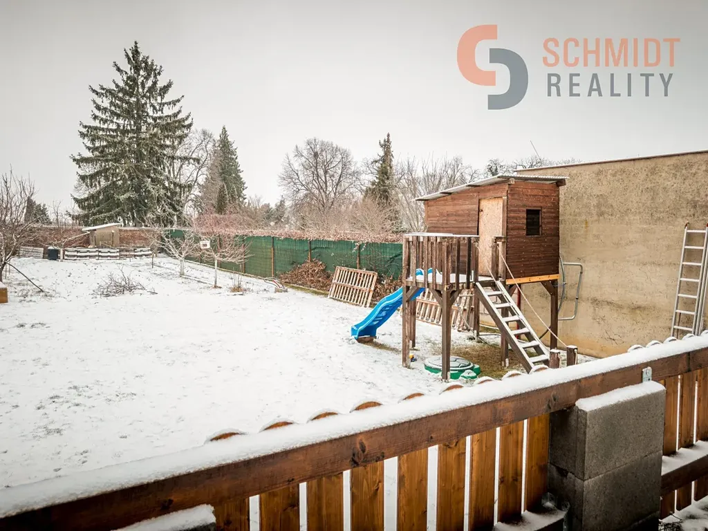 Součástí domu je oplocená zahrada s terasou o ploše cca 35 m² (10 m² zastřešená s LED osvětlením), úložným prostorem pod terasou, retenční nádrží na dešťovou vodu 16 m³, nepoužívaným septikem cca 16 m³. Na zahradě je také rozvod vody a elektřiny, zahradní dětský domek se skluzavkou, jezírko, zděný kurník s automatickým zavíráním a ovocné stromy – jabloně, třešeň, višeň, nektarinka, švestka, pistácie, mandloň, muchovník. Trávník cca 200 m², zbytek pozemku výsadba (vinohrad).