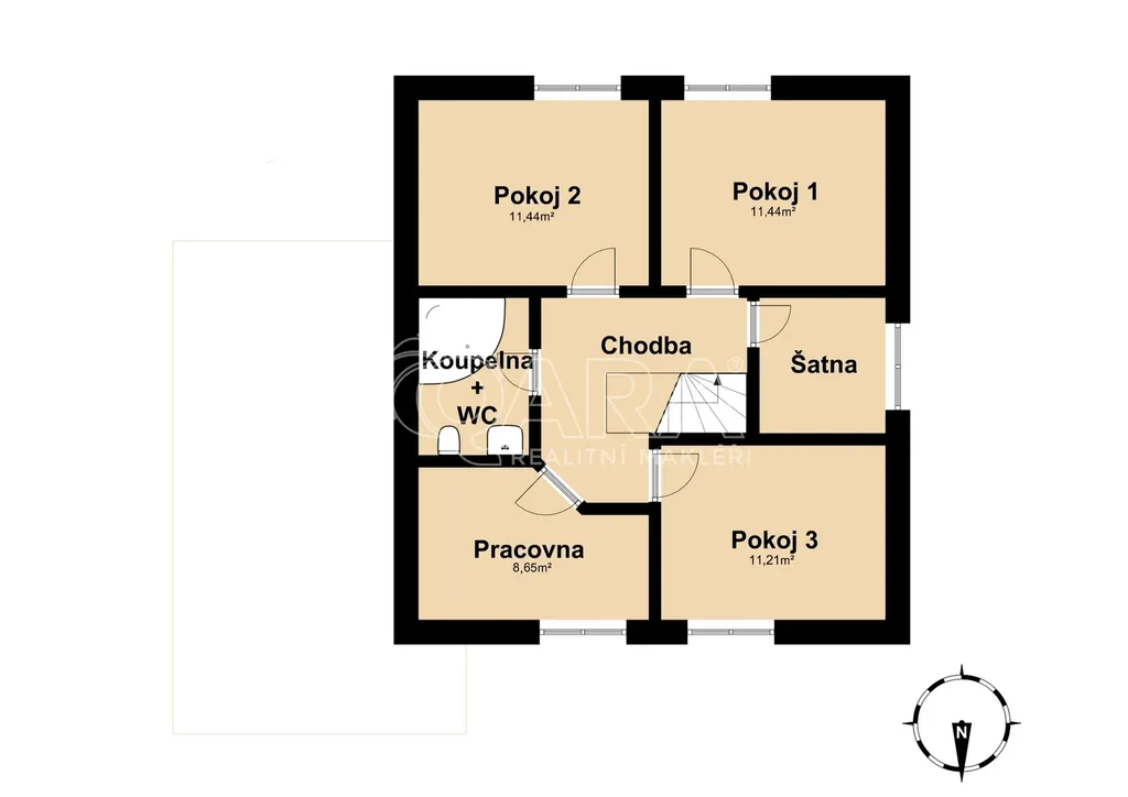 • Patro (2. NP): Klidová zóna se 3 samostatnými ložnicemi, šatnou a kanceláří. K dispozici je také půdní prostor k uskladnění sezónních věcí.
