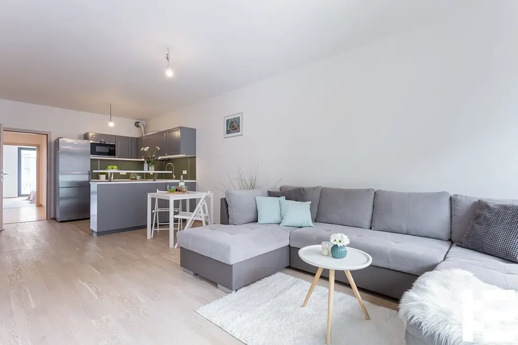 Obývací pokoj s kuchyňským koutem - kompletně zařízená kuchyňská linka vybavena vestavěnými spotřebiči od elektrické trouby po myčku, obývací pokoj s prostornou sedací soupravou, obývací stěna, TV, obě ložnice vybaveny manželskými
