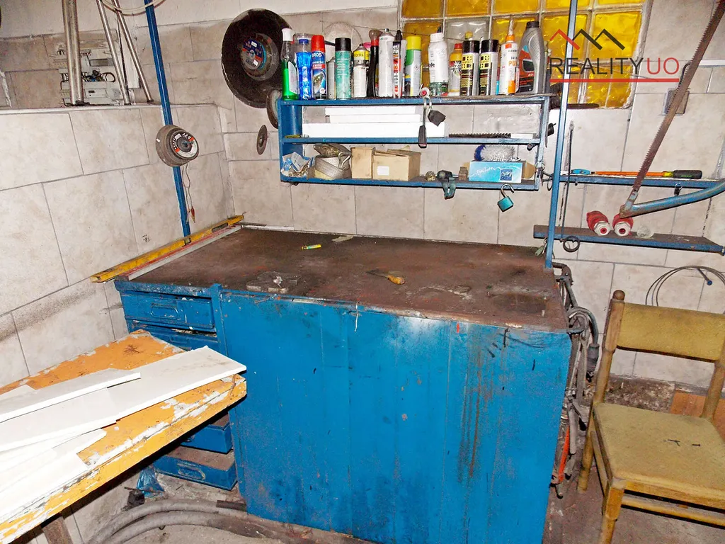 Dílna o rozměrech 11,7 m x 7 m s vraty o rozměrech výška 4,0 m x šířka 3,5 m, má strop vysoký 5,17 m, dvě traverzy ve výšce 4,05 m. Dílna je vytápěna radiátory a byl zde dříve instalován ještě další kotel přímo v dílně. V dílně je malý sklad a WC s umyvadlem. Navazuje koupelna pro dílnu a jedna místnost, která může sloužit jako sklad, jídelna, šatna apod.. Dílna a zázemí dílny je odděleno od domu dveřmi a může fungovat nezávisle na domu. Je zde odpočtový elektroměr.