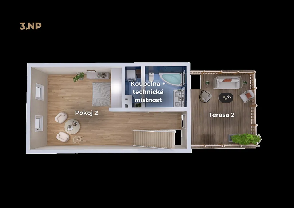 Dispozici dále doplňuje samostatný pokoj, koupelna s toaletou a vstup na menší terasu (12 m²), která poskytuje klidné venkovní zázemí přímo navazující na obytný prostor.