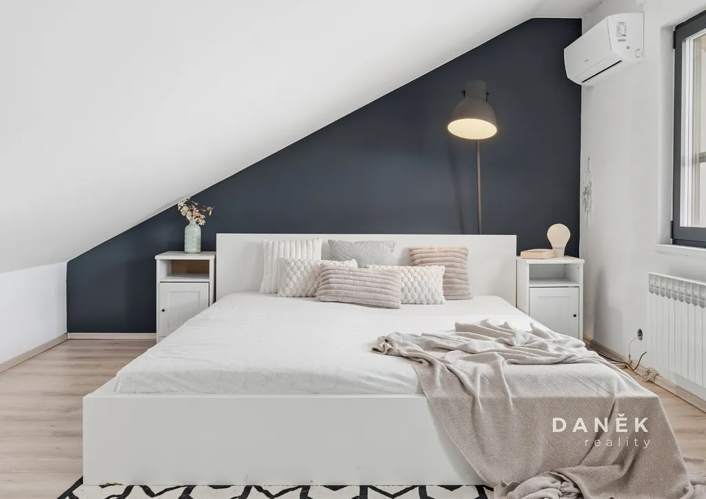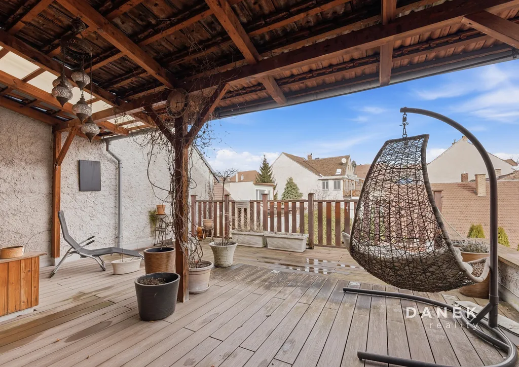 Prostor je vybaven klimatizací a elektrickými žaluziemi, které zajišťují komfortní užívání během celého roku. Střešní konstrukce je zateplena minerální vatou a podkroví prošlo úpravami zahrnujícími nové omítky i úpravy stropů, což prostoru dodává vzdušnost a útulnou atmosféru. Výsledkem je místo, které spojuje charakter historického domu s pohodlím moderního bydlení