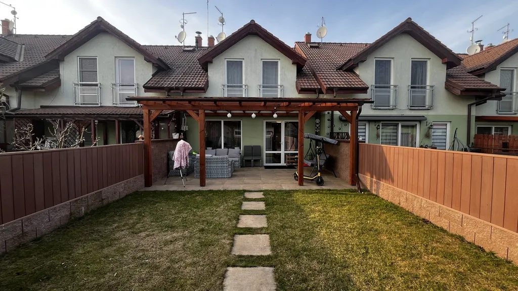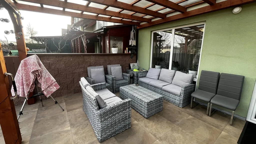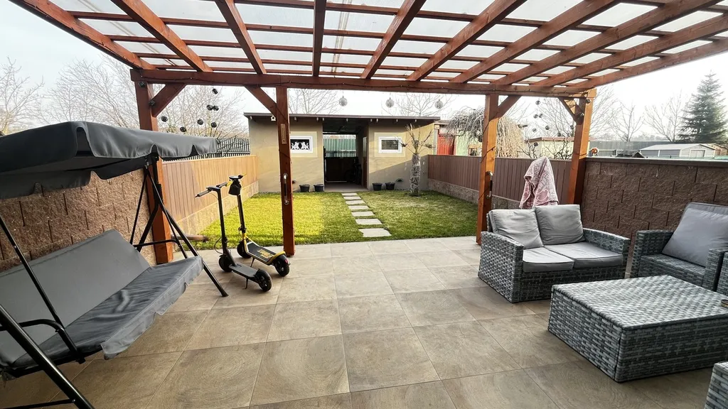Francouzské okno propojuje interiér se zahradou a umožňuje pohodlný vstup na zastřešenou pergolu se zahradním nábytkem. Zahrada je rovinná, pečlivě udržovaná a kompletně oplocená, což z ní činí ideální místo pro odpočinek i rodinné chvíle.
