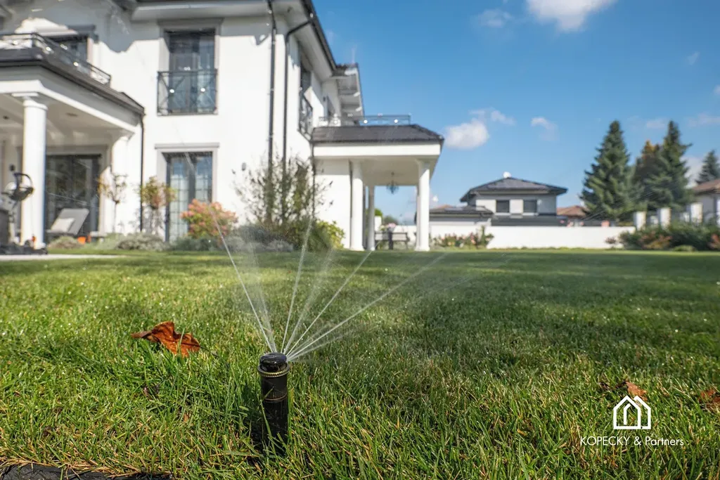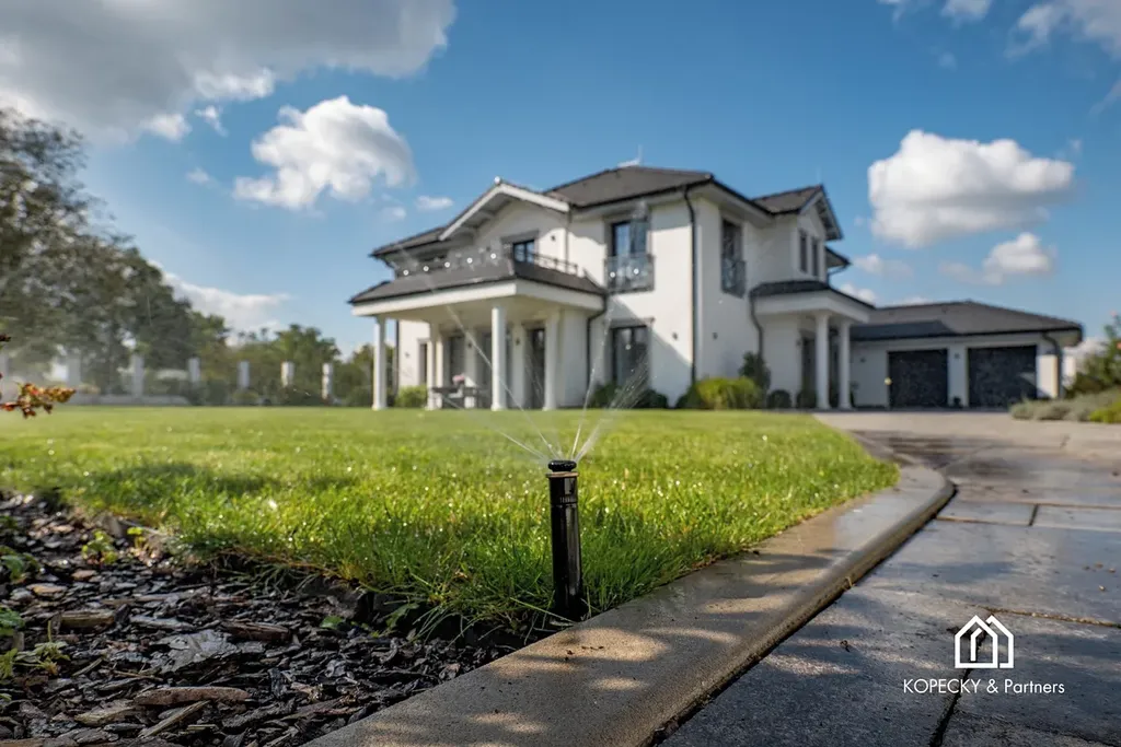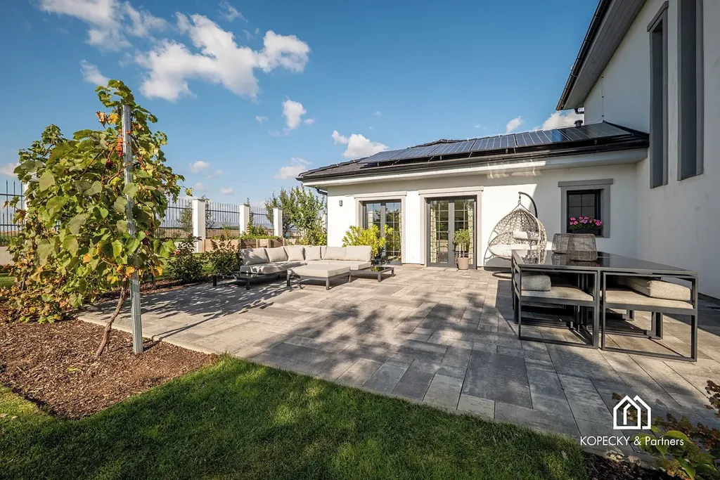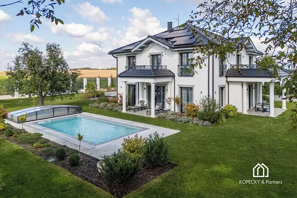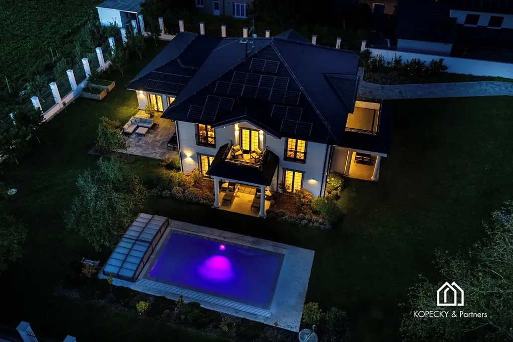 Na profesionálně udržované zahradě najdete zastřešený bazén 8×4 m se slanou vodou, zavlažovací systém, vrtanou studnu a zahradní domek. Parkování je zajištěno v dvojgaráži a na dalších plochách až pro 7 automobilů, včetně přípravy na dobíjení elektromobilů.