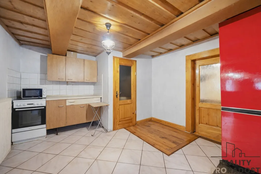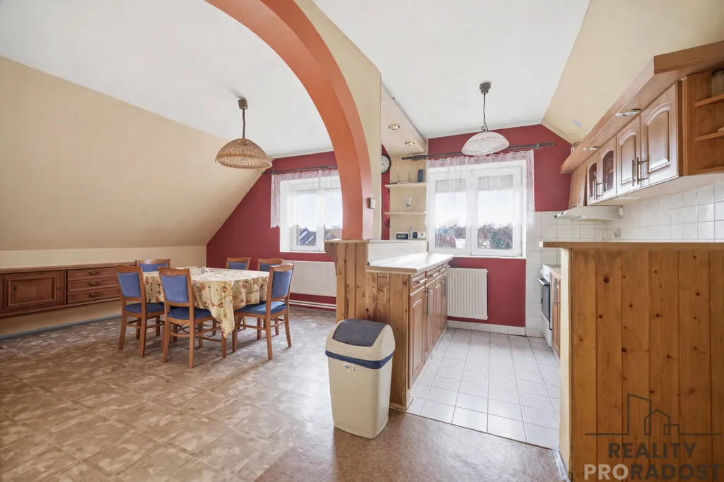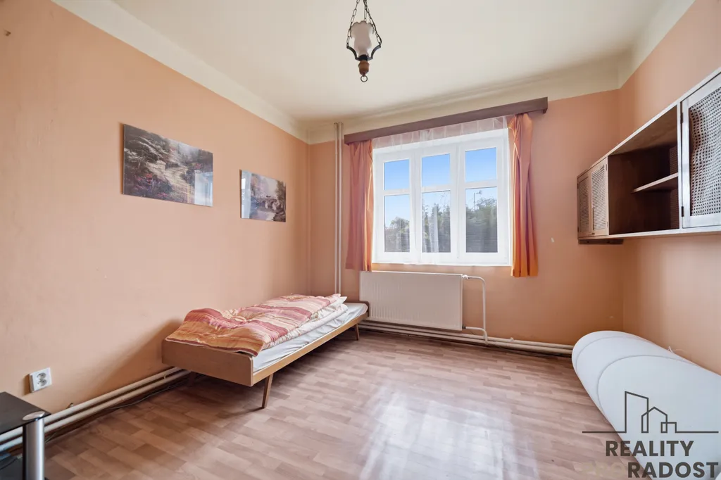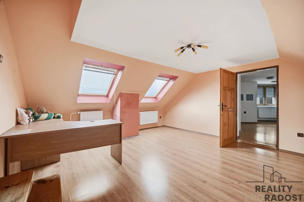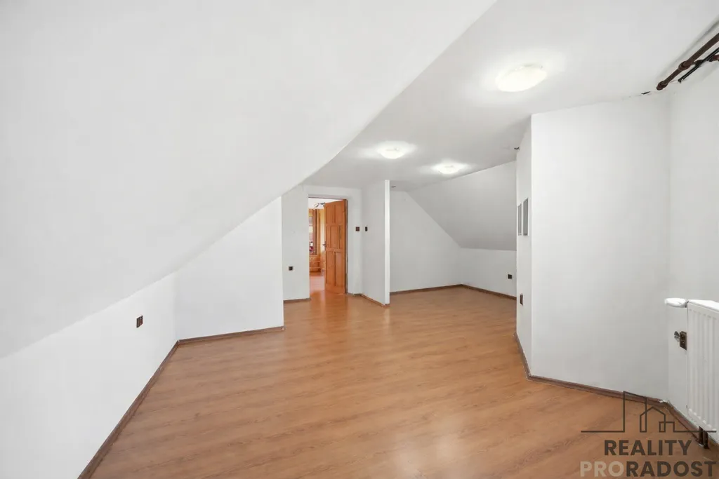 V patře domu se nachází prostorný byt o dispozici 4+1 s balkonem, který nabízí možnost dalšího rozdělení na více bytových jednotek.