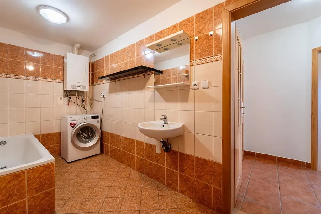 Byt se skládá ze vstupní chodby, ze které lze vejít do samostatného pokoje se střešním oknem, koupelny s vanou a toaletou a hlavního pokoje s kuchyňským koutem. Byt je částečně vybaven a to kuchyňskou linkou včetně sklokeramické desky a trouby, lednicí a pračkou. Ohřev vody a vytápění je zajištěno pomocí plynového kotle.