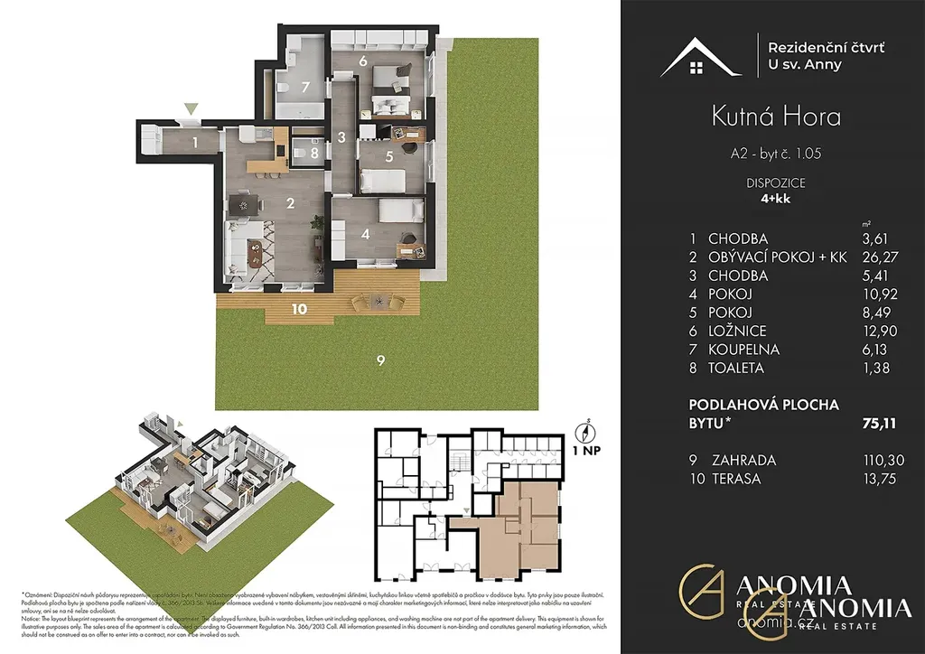 Bytová jednotka s projektovým označením 01.05 o dispozici 4+KK se nachází ve 1. nadzemním podlaží bytového domu BD_A2. Dům bude postaven jako energeticky úsporný s důrazem na použití kvalitních materiálů, které zajistí vysoký standard bydlení. Součástí je také zvuková izolace, která poskytne maximální pocit soukromí a klidu pro všechny obyvatele.