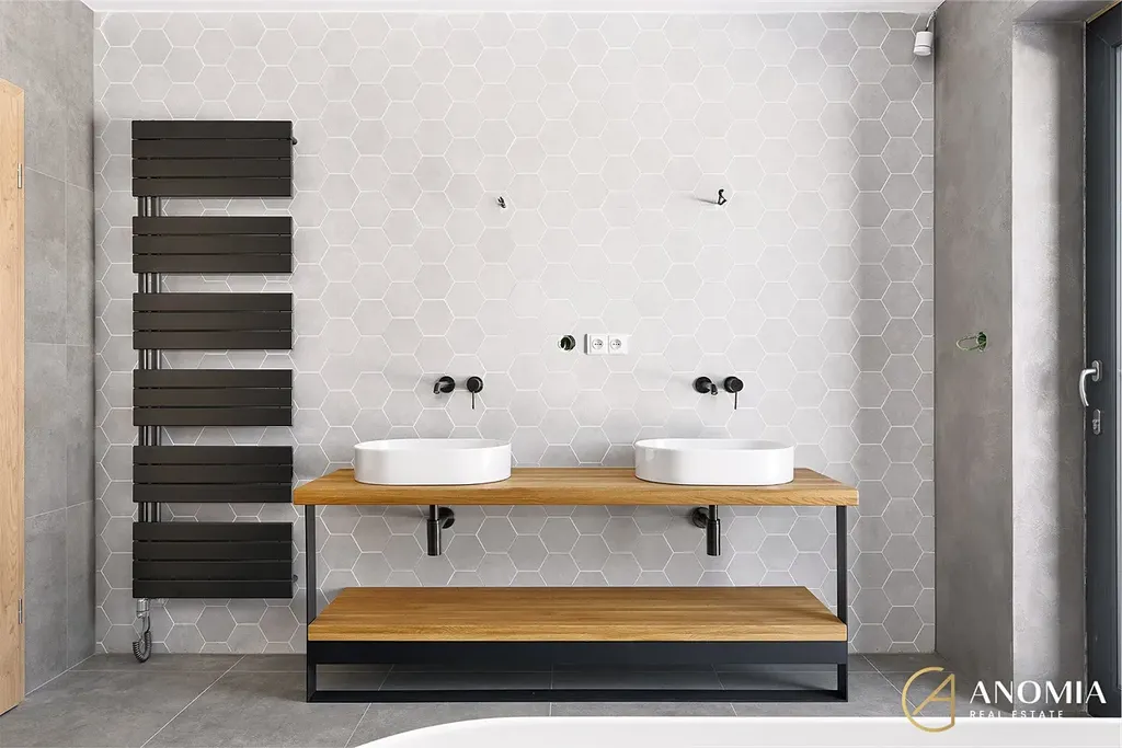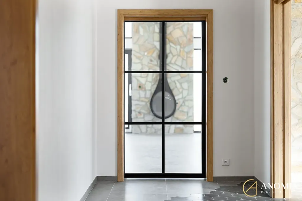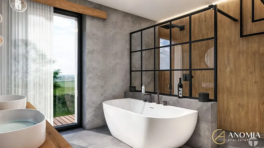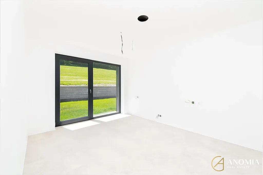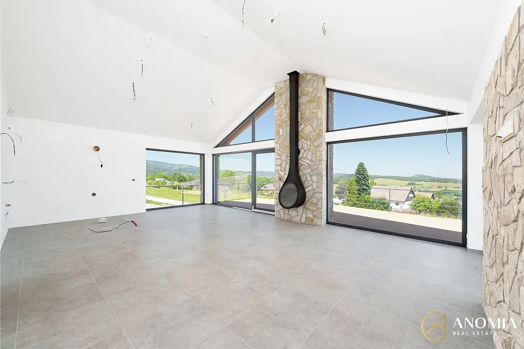 Hlavní obytný prostor, propojený s kuchyní a jídelnou, dominuje panoramatickým oknem s výhledem na Vraní Hory, který vám nabídne nezapomenutelnou atmosféru v každém ročním období. Vila dále disponuje čtyřmi samostatnými pokoji a dvěma koupelnami, které jsou zařízeny v nadčasovém designu (betonové stěrky na stěnách, podomítkové baterie Grohe, kvalitní obklady, kamenické rohy…). Z koupelny v přízemí je možný výstup na terasu a do zahrady, kde je možné si udělat bazén, či vlastní wellness. Díky krajnímu umístění parcely budete mít na pozemku maximum soukromí.