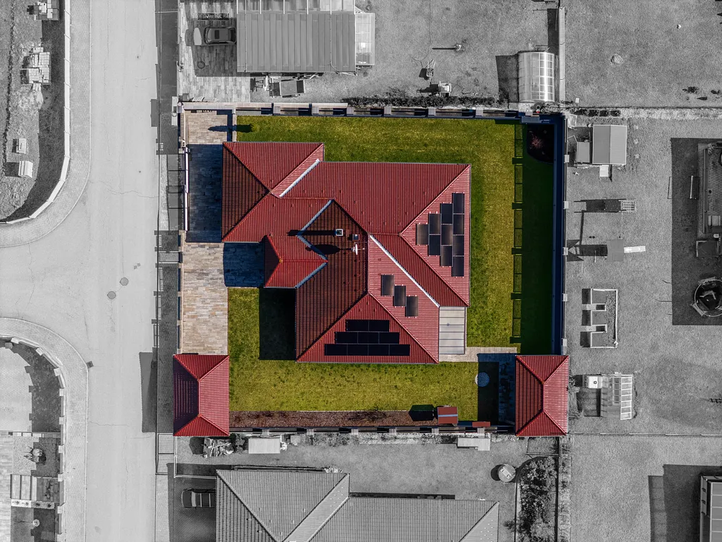 Součástí domu je dvougaráž s technickým zázemím pro fotovoltaiku a navíc další samostatná garáž na pozemku.