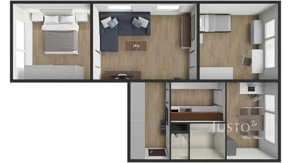 Výhodou je variabilita dispozice – vedle kuchyně se nachází menší místnost, kterou lze využít jako jídelnu, pracovnu nebo pokoj pro home office. Zároveň je zde možnost rozšíření kuchyně a vytvoření většího obytného prostoru.