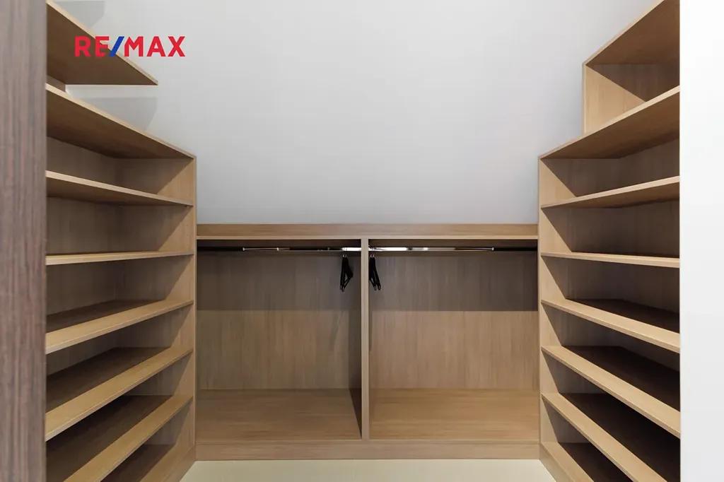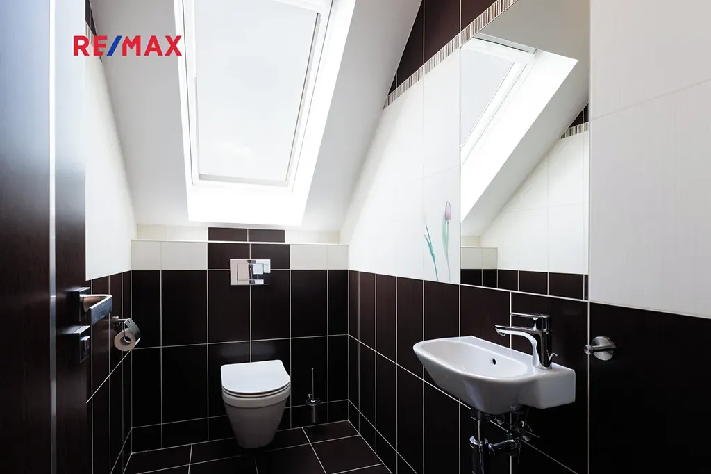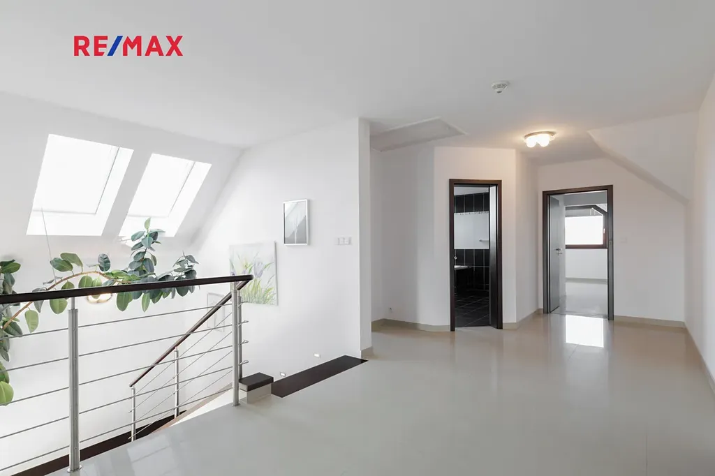 Při stoupání do prvního patra se nám nabídne prostorná chodba se vstupy do 3 ložnic, z nichž jedna z nich lze rozdělit na dva samostatné pokoje. Součástí každé ložnice je šatna s úložným prostorem. V prvním patře najdeme další koupelnu, tentokrát s vanou i se sprchovým koutem, dále pak samostatné WC.