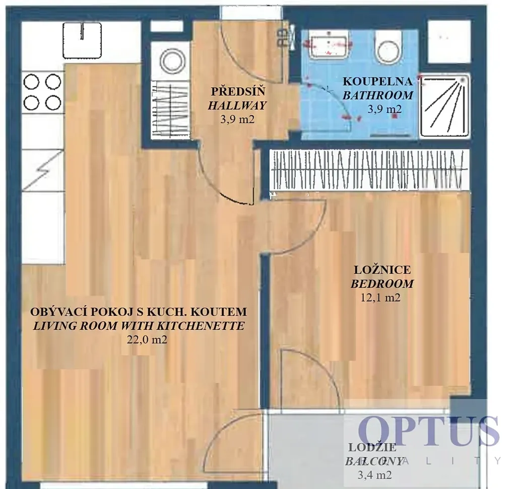 Byt tvoří prostorný obývací pokoj o velikosti 22 m2 s plně vybaveným kuchyňským koutem a se vstupem na lodžii, ložnice (12,1 m2) rovněž se vstupem na lodžii, koupelna se sprchovým koutem + WC a předsíň.