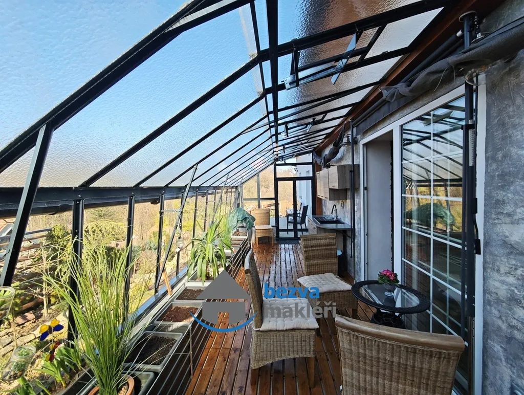 Prosluněná zahrada je koncipována spíše jako okrasná, nicméně je zde i několik ovocných stromů a vyvýšené záhony. Pod verandou a terasou je úložný prostor pro zahradní techniku, nářadí a náčiní. Zhotovení zábradlí a schodů na terasu bude již v režii nového majitele. K dispozici zůstává dřevo na jednu topnou sezónu.