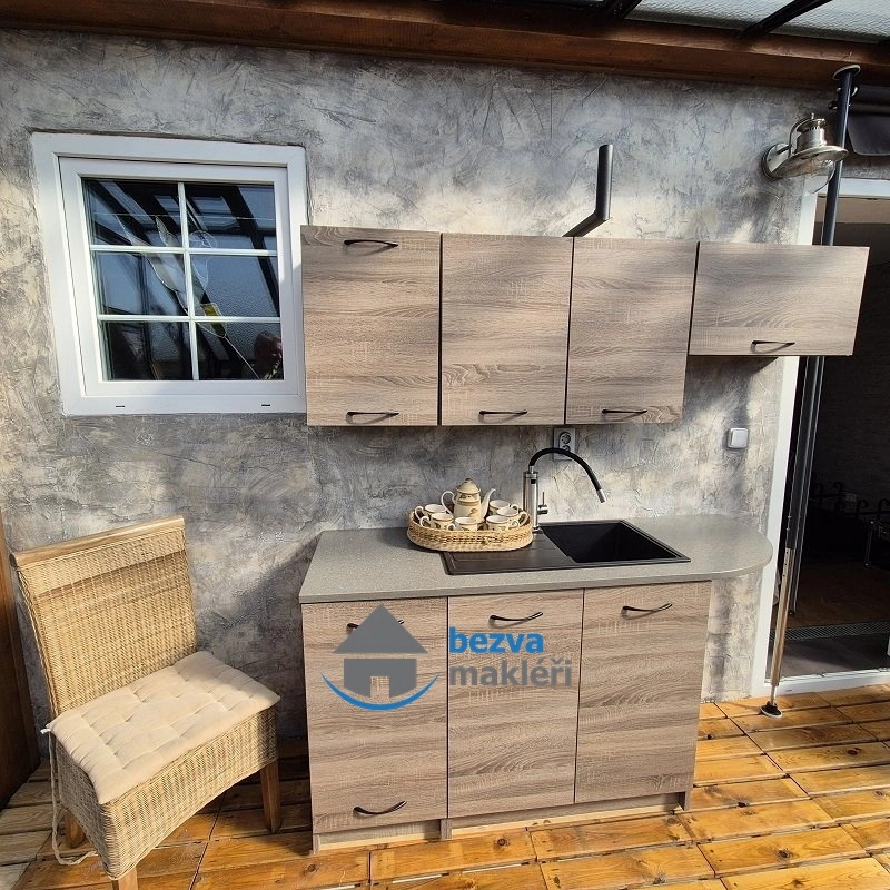 Kuchyně je vybavena zánovní kuchyňskou linkou s vestavnou troubou, sklokeramickou varnou deskou a myčkou a jsou zde i kamna na dřevo. Samozřejmostí je, z kuchyně přístupná, komora na potraviny.