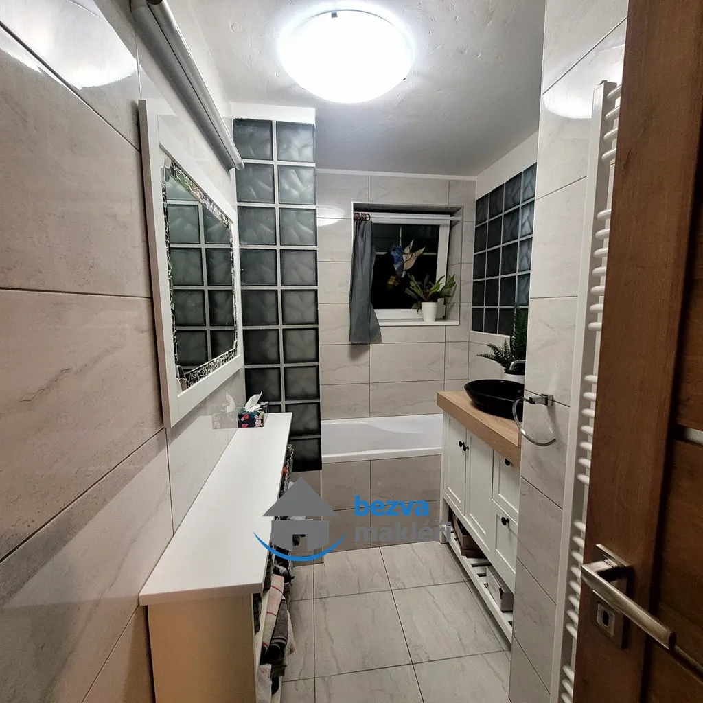 Koupelna opatřena vanou se sprchovací zástěnou, kamenným umyvadlem a koupelnovým nábytkem. WC je oddělené.