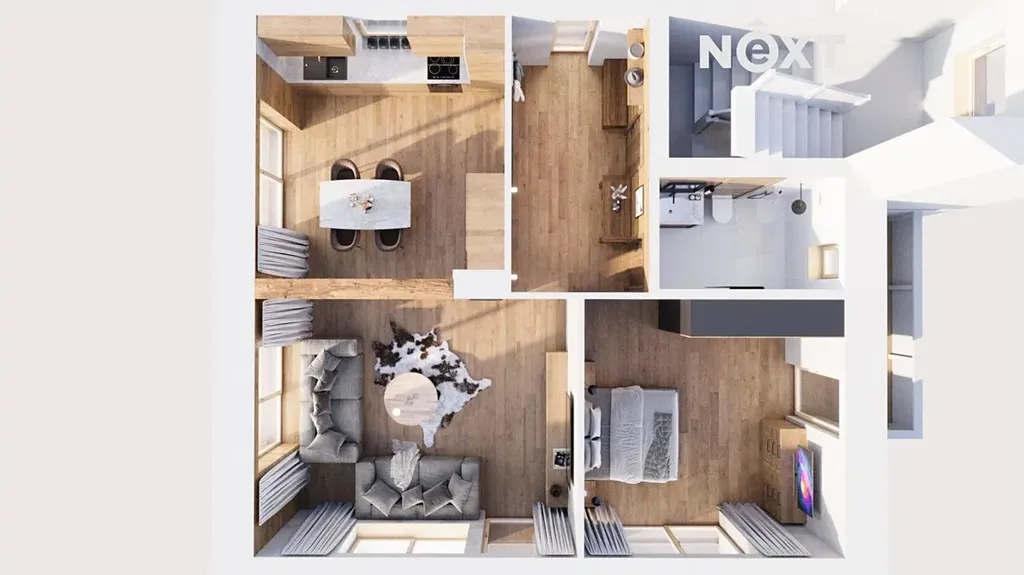 Apartmán nabízí flexibilní dispozici, kterou si můžete přizpůsobit podle svých představ: