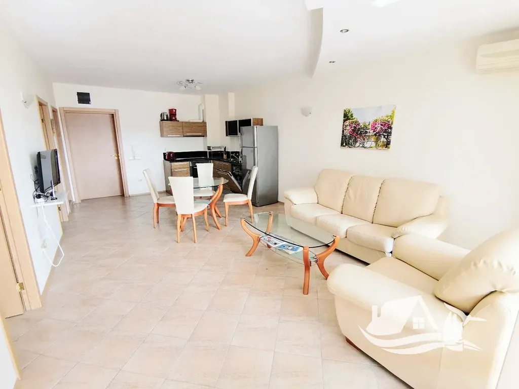 Nabízíme prostorný byt se dvěmi ložnicemi ve třetím patře v uzavřeném komplexu, který se nachází v malebné oblasti "Čaika" v klidného přímořského města Byala, 450 metrů od písečné pláže a přístavu, a restaurace "Čaika" s krásným výhledem na moře a zátok. Byt se skládá z prostorného obývacího pokoje s kuchyní a jídelním koutem ve společném prostoru, hlavní ložnice s vlastní koupelnou s toaletou, druhá ložnice, druhá koupelna s toaletou a prostorné terasy s výhledem na moře a upravené území komplexu. K bytu náleží sklep. Má velkou plochu, vhodný na pohodlné dovolené i pro velkou rodinu. Užitná plocha (včetně sklepa o ploše 6 m2) je 101 m2, celková plocha je 120 m2. Byt je dobře zařízený a vybavený a cena je včetně nábytku a vybavení dle fotografií. Oplocený areál komplexu má následující vybavení: 2 bazény, rekreační oblast s lehátky a slunečníky, restaurace, parkoviště, minimarket, posilovna, masážní místnost, dětské hřiště a spousta zeleně. Roční poplatek za údržbu je 15.50 €/m2.