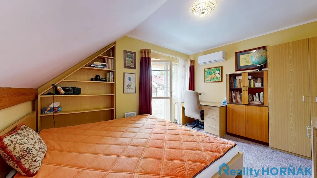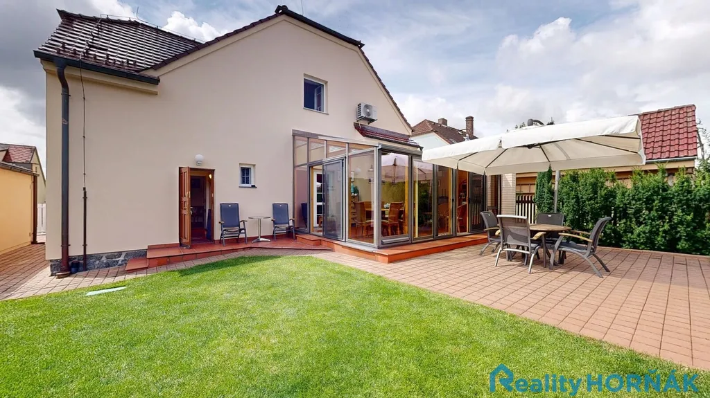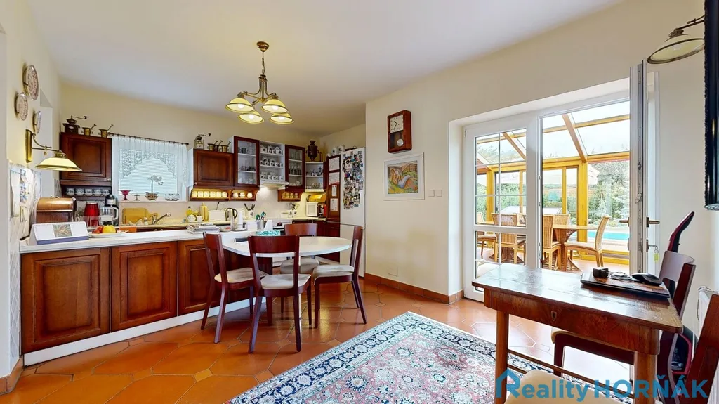 K severní straně domu přistavena zimní zahrada (23 m²) v luxusním provedení (exotické dřevo, stínící systém, sítě proti hmyzu, klimatizace, ratanový nábytek), poskytující nečekaně těsný kontakt s venkovní přírodou.