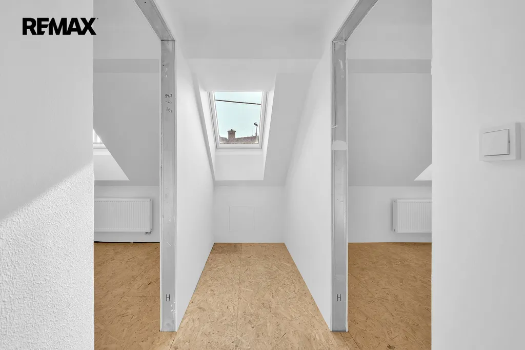 Ložnice v patře budou předány s dokončenými dveřmi, podlahy jsou na výběru kupujícího. Kuchyň je připravena k instalaci – k dispozici je vizualizace interiéru, která kupujícímu umožní přizpůsobit prostor svým představám.