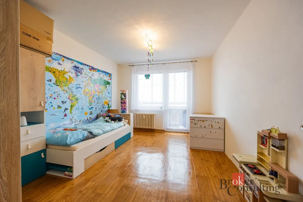 Dalšími místnostmi jsou komfortní ložnice a samostatný dětský pokoj, které poskytují dostatek soukromí i prostoru. Byt dále disponuje velkou vstupní chodbou, která působí velmi vzdušně a nabízí možnosti pro další úložné řešení. Praktickým bonusem je také komora, která zajišťuje další místo pro ukládání věcí.