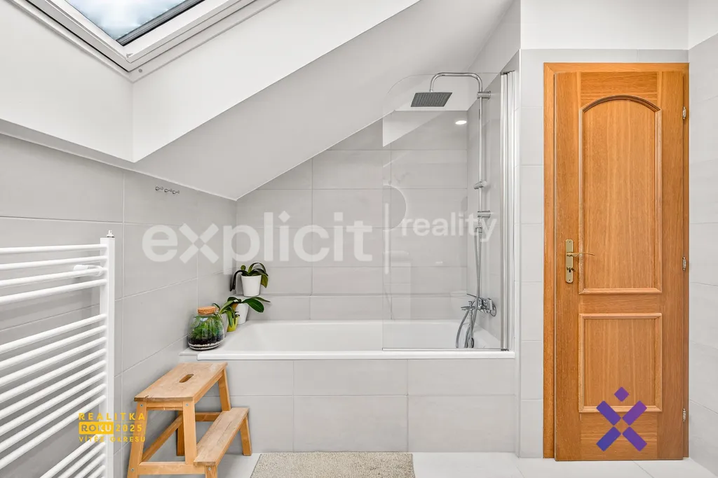 V horním patře jsou situovány další tři místnosti – ložnice, pokoj a pracovna se šatnou. Součástí patra je také prostorná koupelna s vanou a druhou toaletou.