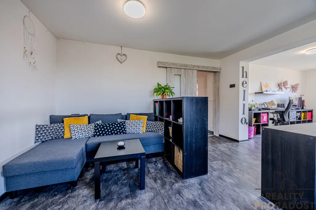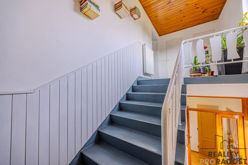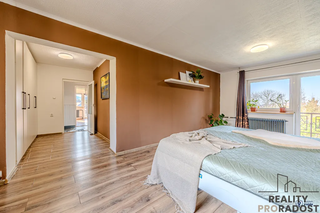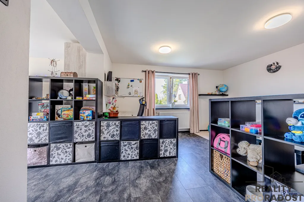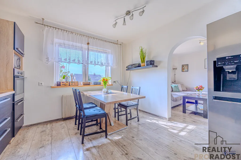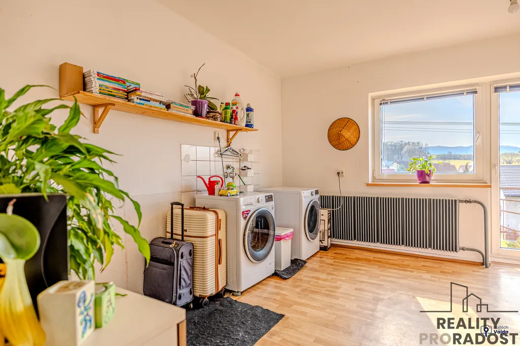 Obě nadzemní podlaží disponují bytovou jednotkou 3+1 + komora + sociální zázemí, kdy v současné době rodina obývá celý dům, jeden pokoj v přízemí slouží jako šatna a jeden pokoj v 1.patře slouží jako prádelna. Při vhodné rekonstrukci a dodělání kuchyně v 1.patře, je však možné využít rodinný dům jako dvougenerační. Z obývacího pokoje v přízemí je vstup na krytou terasu, kterou si jistě užijete od brzkých jarních do pozdních letních dní, stejně jako zahradu, kde zůstává dětský domeček, trampolína a bazén.