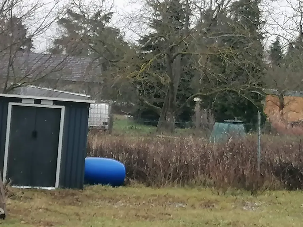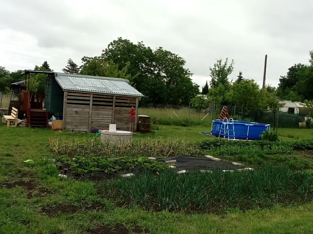Na zahradě je stará maringotka, suché WC, bouda na nářadí.