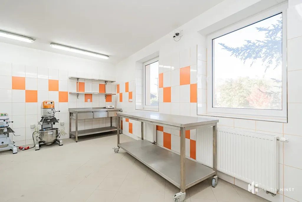 Nabízíme Vám pronájem kompletně vybaveného výrobního prostoru zkolaudovaného jako pekárna v obci Zlonín. Prostor o ploše 55 m² se nachází v přízemí patrového cihlového domu ve velmi dobrém stavu. Vybavení zahrnuje 4 malé a 1 velký nerezový stůl, 6 velkých a 1 malou nástěnnou nerezovou polici, 2 velké lednice, 1 velký mrazák, 1 plynový konvektomat s odsáváním, 1 velký a 1 malý mixér, 4 pojízdné nerezové stojany s plechy, nerezový dvojdřez a malé dřezy s výlevkami. Součástí je také šatna, WC, velká výlevka. Vytápění a ohřev vody je řešeno plynovým kotlem.