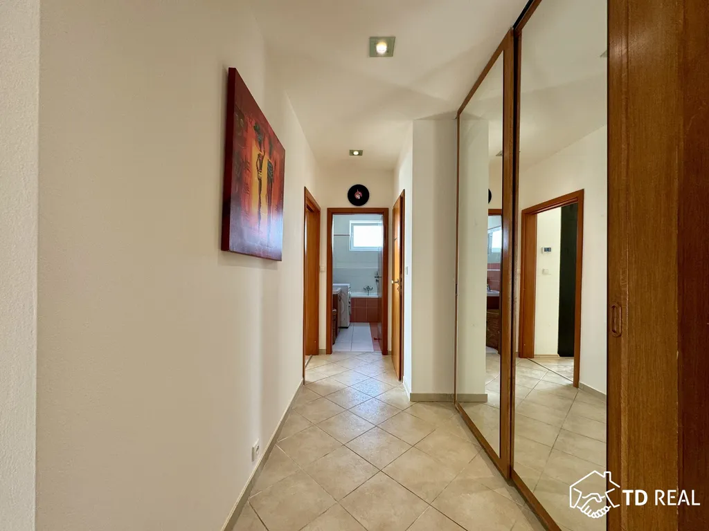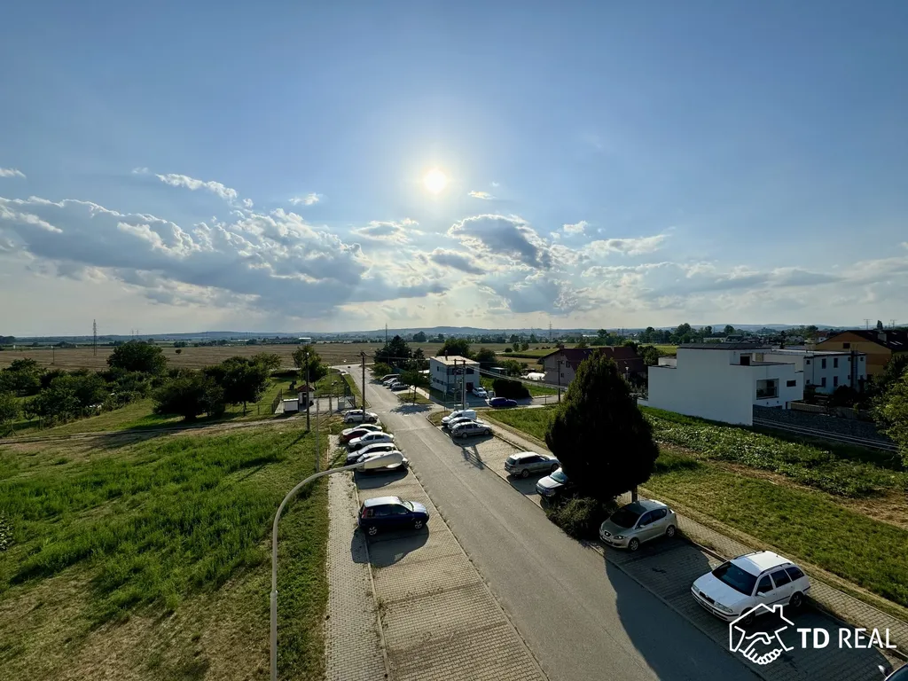 Dispozice: chodba se vstupy do všech místností bytu – dětský pokoj (14,4 m2), ložnice (15m2), obývací pokoj s kk (25,7m2), koupelna, samostatná toaleta, prostorná šatna. Součástí bytu je také balkon s krásným výhledem do okolí, byt nedisponuje sklepní kójí. Součástí bytu je také garážové stání pro Váš automobil.