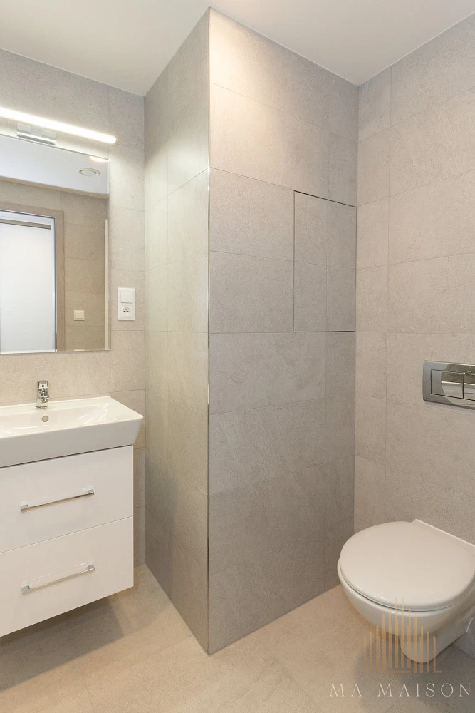 Komfort bydlení zvyšuje klimatizace a rekuperace vzduchu. Byt je dále vybaven venkovními roletami, které poskytují větší soukromí a regulaci světla. Velkou výhodou bytu je prostorný sklep. Součástí pronájmu je také garážové stání přímo v budově, které je již zahrnuto v ceně nájmu.