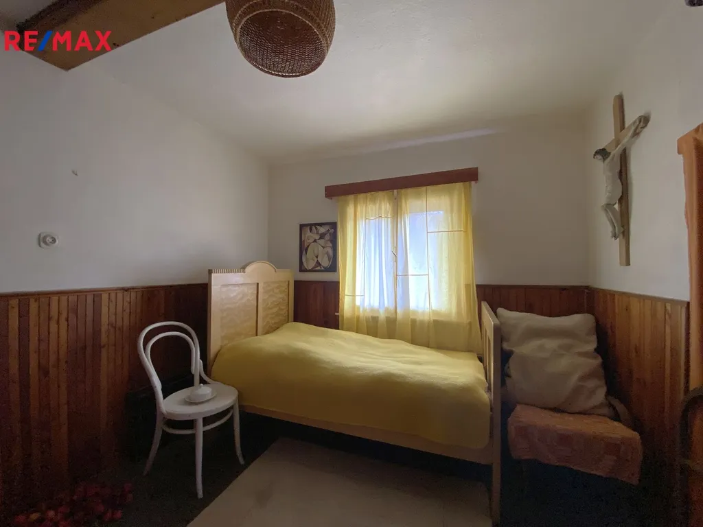 Dům má v přízemí kuchyň, obývací pokoj, pokoj, koupelnu a WC.