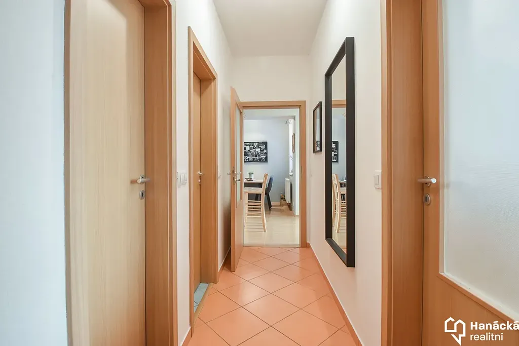 S výhradním zastoupením nabízíme ke koupi velmi pěkný cihlový byt o dispozici 2+kk s velkou terasou a zděným sklepem v Olomouci na ulici Peškova. Jedná se o byt v osobním vlastnictví nacházející se ve zvýšeném přízemí pětipodlažního cihlového bytového domu (postaveného v roce 2007) s výtahem a bezbariérovým přístupem. Byt má praktické dispoziční uspořádání a nadstandardní podlahovou plochu 62,1 m2. Prostorná terasa s výměrou 40,9 m2 je přístupná jak z obývacího pokoje, tak i z ložnice. Je orientovaná východním směrem a zásadním způsobem zvyšuje užitnou plochu bytu a možnost relaxovat, obklopit se zelení, něco si venku ugrilovat apod. Kuchyň je od obývacího pokoje částečně oddělena barovým stolem a prostorem pro stolování. Koupelna je vybavena vanou, umývadlem a disponuje i prostorem pro pračku a sušičku. WC je samostatné. K bytu náleží také zděný sklep cca 2,8 m2. Vytápění bytu je řešeno ústředním topením z dálkového zdroje, ohřev vody je centrální pro celý objekt. Celkově se jedná o velmi vkusně, moderně a přitom prakticky řešený byt s nízkými měsíčními náklady na bydlení. Koupi bytu je možné financovat hypotékou, v případě zájmu nechá majitel v bytě i téměř veškeré zařízení. Vhodné i jako investice k následnému pronájmu. Bližší informace u makléře zakázky.