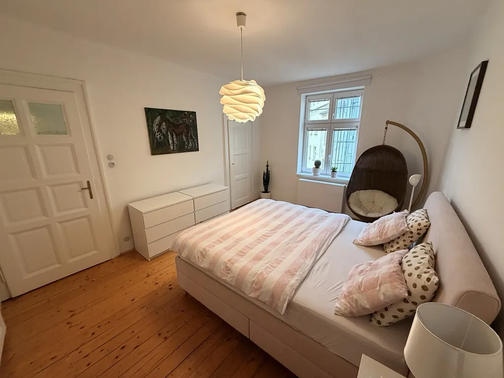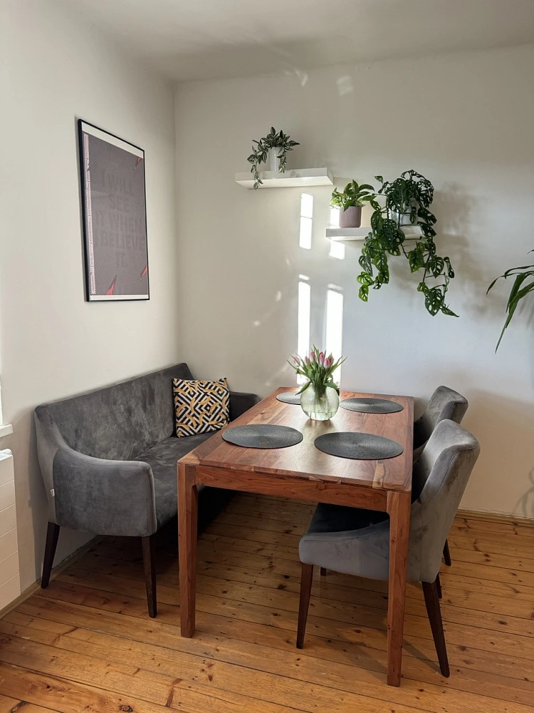Byt je po kompletní rekonstrukci a spojuje klasické prvky vinohradské zástavby s moderním designem — vysoké stropy, tradiční dřevěná podlaha a okna na dvě světové strany s výhledem do klidného vnitrobloku a na západ slunce směrem k Vinohradům.