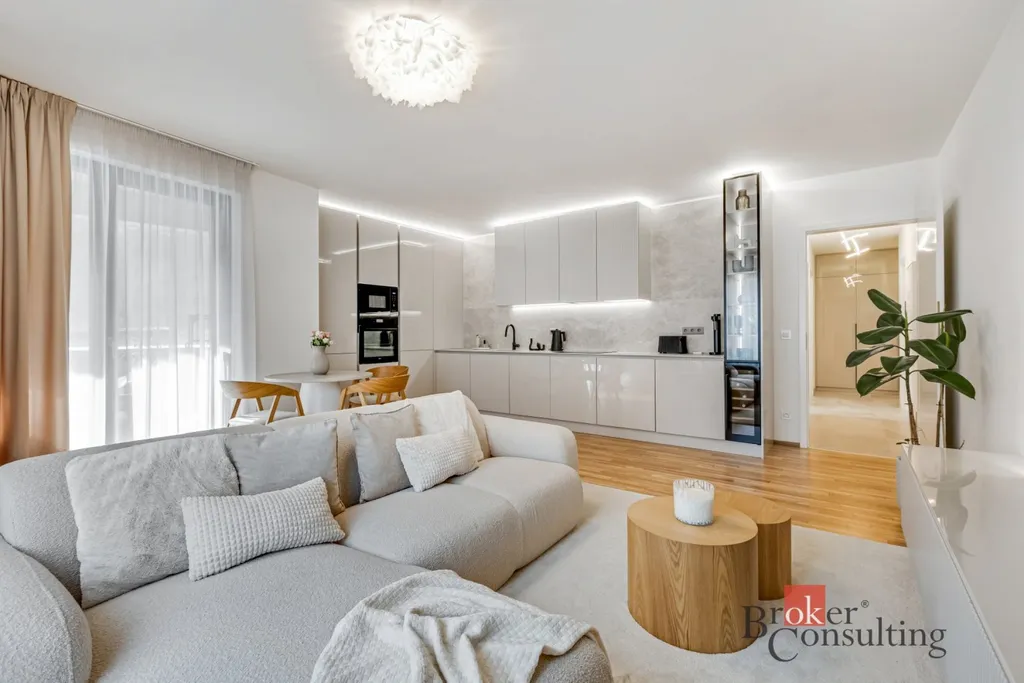 Nábytek i doplňky pocházejí od renomovaných italských značek a vytvářejí příjemnou a kultivovanou atmosféru pro komfortní bydlení. Byt se pronajímá kompletně zařízený – od kávovaru až po pračku a sušičku. Stačí přijít s kufrem a začít bydlet.