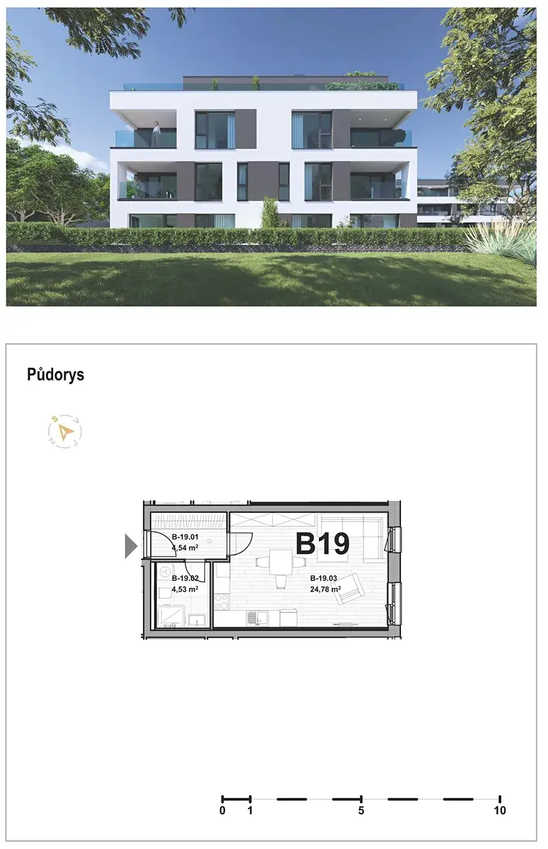 Jednotka B19 sestává z obývacího pokoje s kuchyňským koutem, koupelny s WC a předsíně. Součástí je i sklepní box v suterénu budovy.