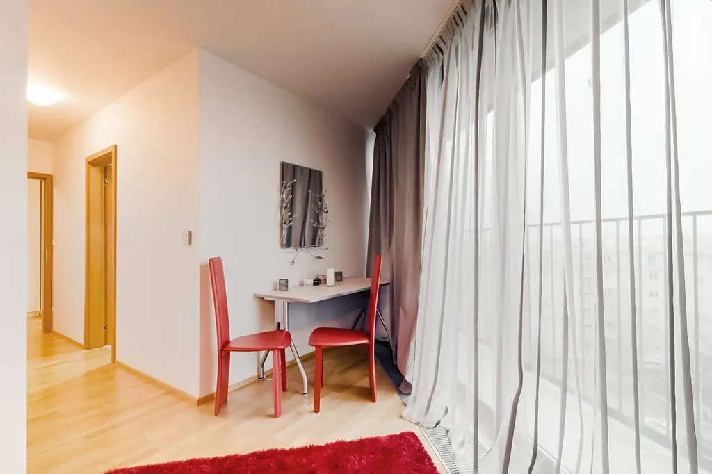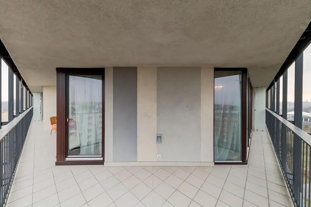 Dominantou bytu je prostorný obývací pokoj (téměř 32 m²) s plně vybavenou kuchyňskou linkou a přímým vstupem na velkou rohovou terasu o výměře 23,30 m², která nabízí dostatek prostoru pro venkovní posezení i relax. Díky umístění v 9. patře je byt velmi světlý, vzdušný a nabízí příjemné výhledy do okolí.