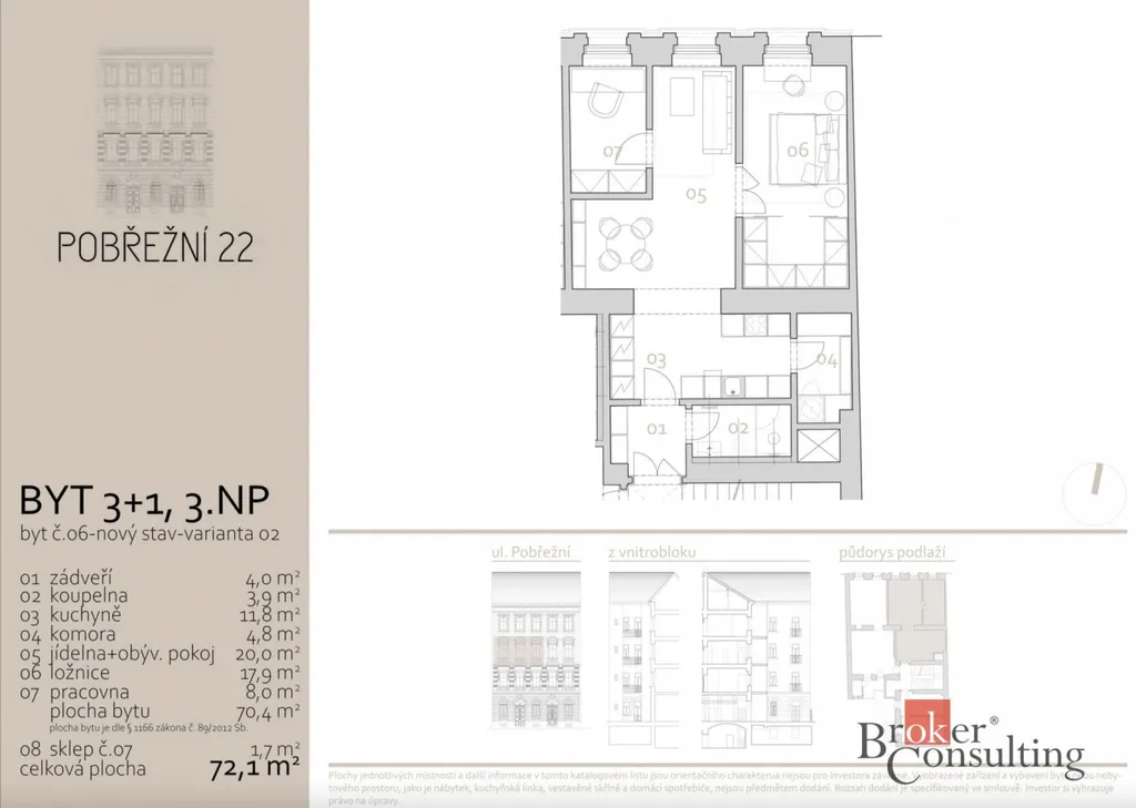 Konkrétně tento byt má dispozici 3+kk a celkovou plochu 72,1 m2, z toho sklep má 1,7 m2. Nachází se ve třetím nadzemním podlaží historického cihlového domu.