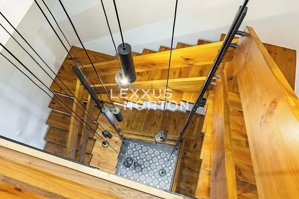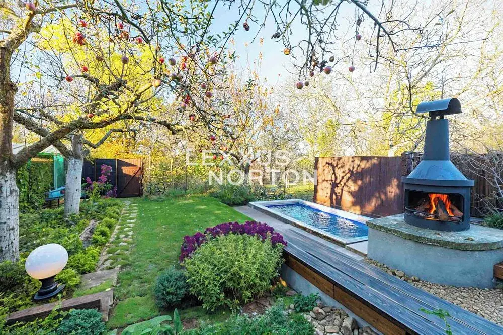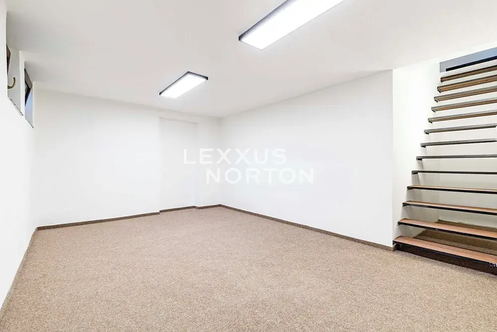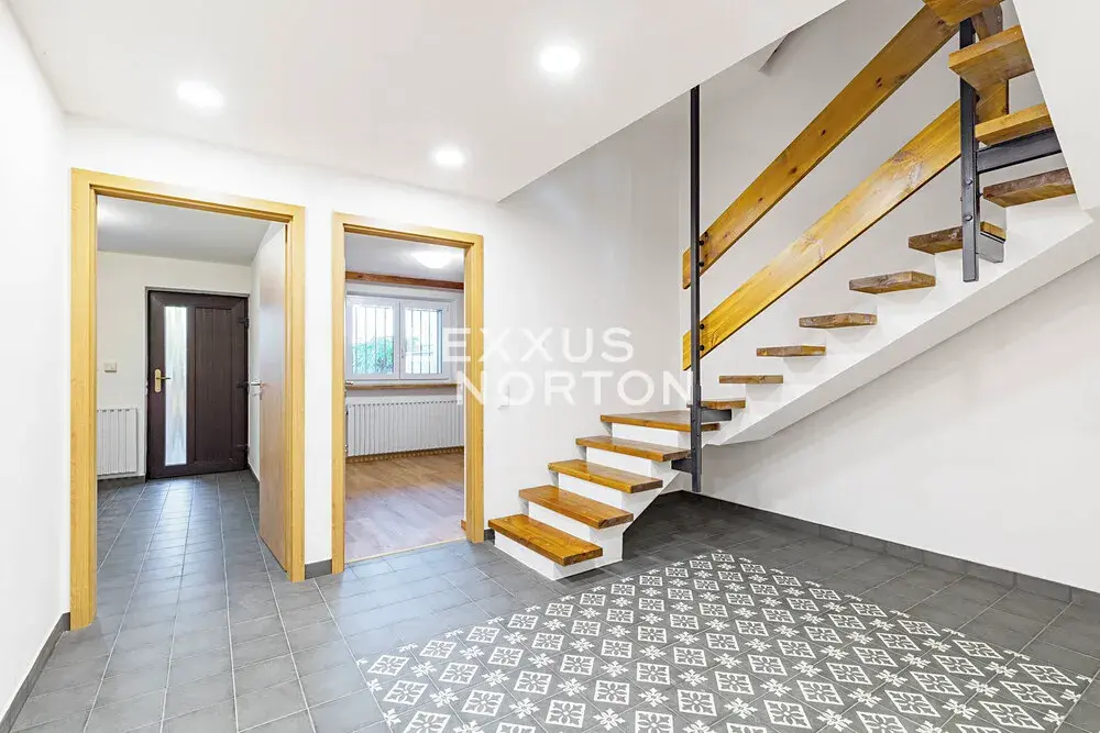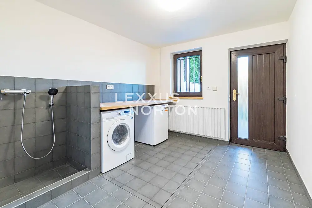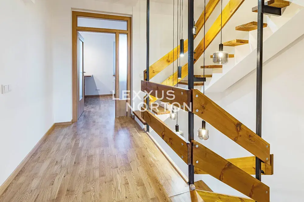 Interiér tvoří v přízemí vstupní chodba také se zadním vchodem na zahradu s bazénem, koupelna (sprchový kout) a sauna. V patře pak naleznete obývací pokoj s balkónem, kuchyň s přímým vstupem na terasu s výhledem na zahradu, koupelnu (vana a toaleta) a samostatnou toaletu. V dalším patře pak 2 ložnice a koupelnu (sprchový kout a toaleta). Suterén nabízí herní prostor pro děti nebo fitness. K domu náleží garáž a venkovní stání přímo před domem na pozemku.