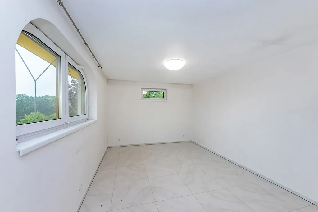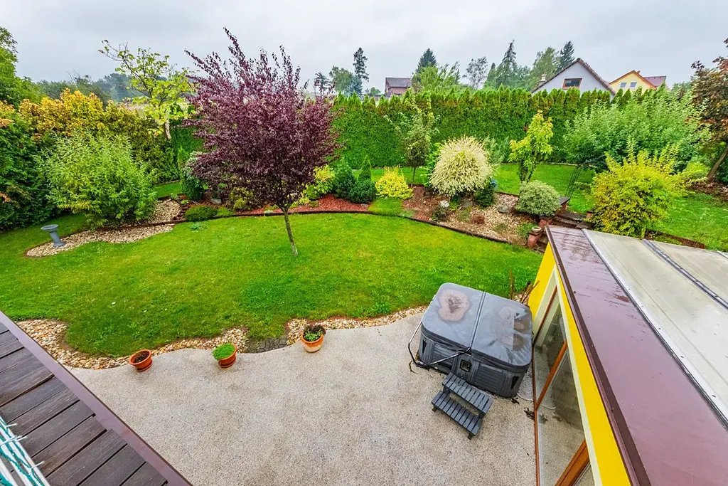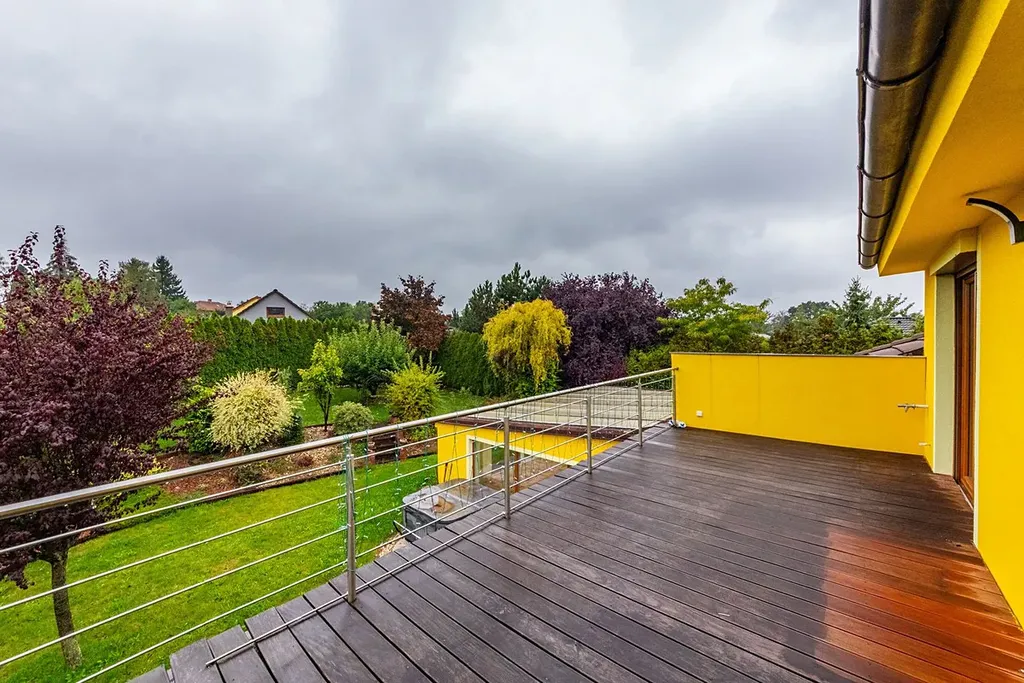 Dům sestává - v 1. nadzemním podlaží se nachází prostorný obývací pokoj s kuchyňským koutem, 2x pokoj pro hosty, koupelna s vanou a WC, technická místnost, prostorná chodba a samostatné WC. Z obývacího pokoje je vstup na terasu a zahradu. V 2. nadzemním podlaží se nachází dvě ložnice, pracovna, šatna, tělocvična, koupelna se sprchovým koutem, vstup na půdu a terasa s výhledem na krásně udržovanou zahradu. Podlahová plocha domu 218 m2.
