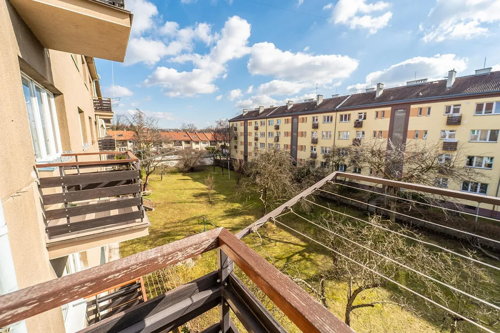 Dispozice je velmi praktická - tři samostatné pokoje, samostatná kuchyně se spíží, dále komora, koupelna a oddělené WC. Příjemným bonusem jsou dva balkony větší přístupný z obývacího pokoje a menší z kuchyně.